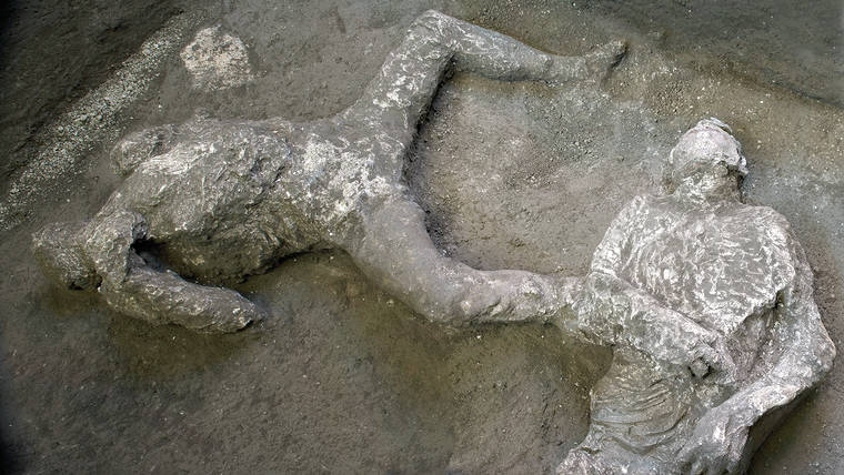 The remains of the two victims, lying next to each other on their backs, were found in a layer of gray ash at least 2 meters (6.5 feet) deep, they said.
