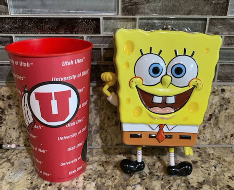 In this photo provided by Utah sports writer Andy Larsen are a childhood piggybank, right, and a plastic cup on Tuesday, Nov. 24, 2020, in Salt Lake City. Larsen’s spontaneous tweet looking for someone in need to whom he could give the $185 he had in the two items quickly snowballed into tens of thousands of dollars in donations from strangers, as well as messages from people who could use the help. (Andy Larsen via AP)