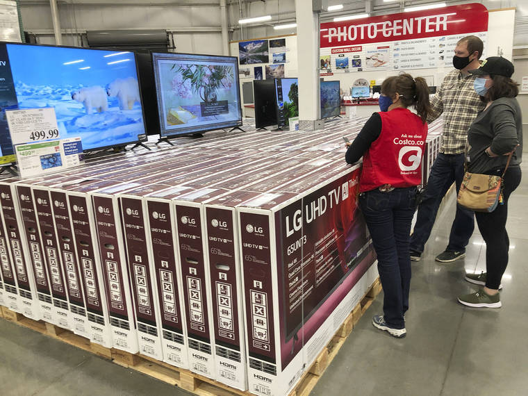 A sales associate helps customers as they consider the purchase of a big-screen television at a Costco warehouse on Wednesday, Nov. 18, 2020, in Sheridan, Colo. U.S. consumer confidence fell to a reading of 96.1 in November as rising coronavirus cases pushed Americans’ confidence down to the lowest level since August. The Conference Board said the November reading represented a drop from a revised 101.4 in October. (AP Photo/David Zalubowski)