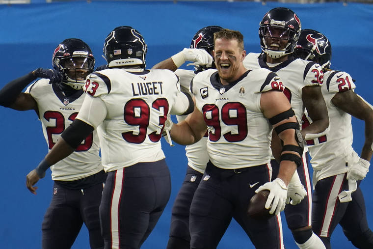 Associated Press Houston defensive end J.J. Watt (99) celebrates his interception for a touchdown Thursday during the first half in Detroit.
