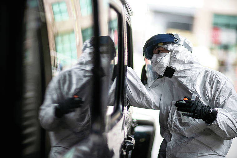 A passenger gets swabbed for COVID-19 at a testing site Tuesday at the convention center in Providence, R.I. (AP Photo/David Goldman)