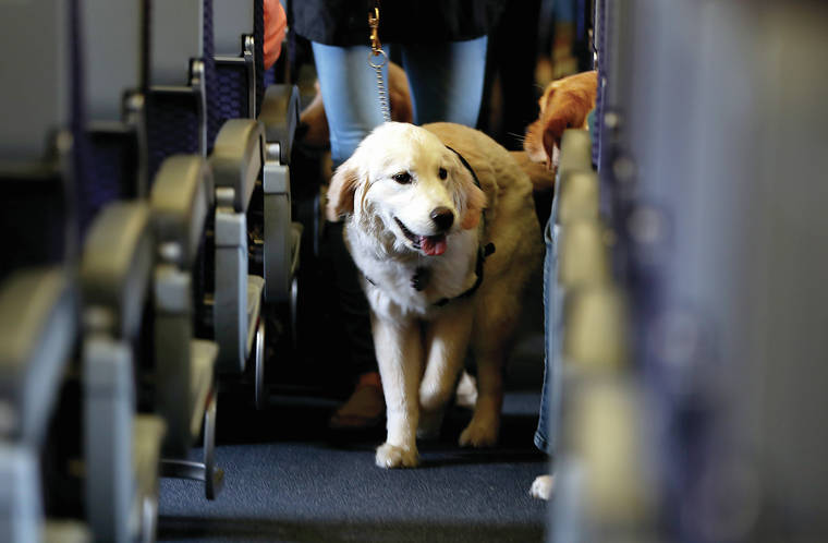 In this 2017 file photo, a service dog strolls through the isle inside a United Airlines plane at Newark Liberty International Airport while taking part in a training exercise in Newark, N.J. (AP Photo/Julio Cortez, File)