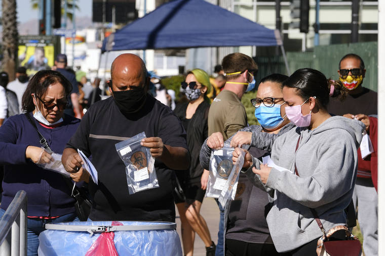 Associated Press People drop their test kits into an intake receptacle at a COVID-19 testing site Saturday in Los Angeles. Many health officials say rapid and at-home tests should be used so Americans can check themselves.