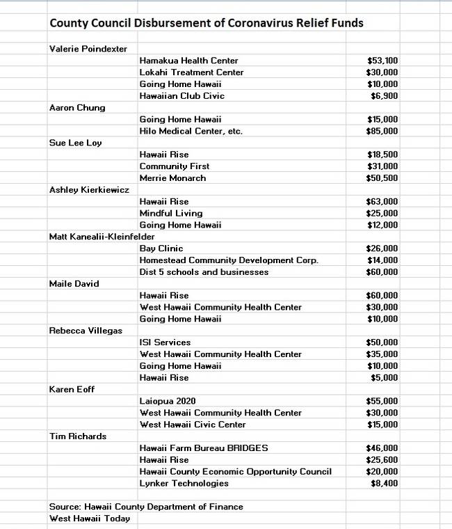 Hawaii County Council members focused on food and social and educational programs in divvying up $100,000 in coronavirus relief funds each of the nine members received last summer for projects in their communities.