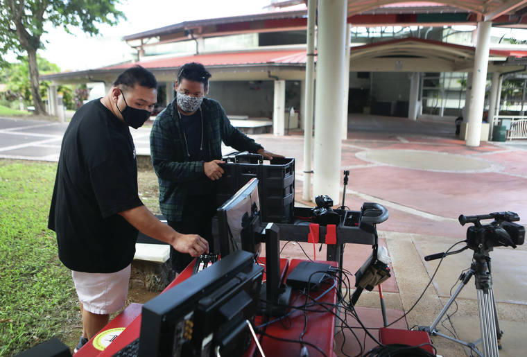 Kelsey Walling/Tribune-Herald Blaine Bautista, left, and Randall Tanaka test out equipment that will be used for the University of Hawaii at Hilo drive-through commencement ceremony next week on Friday, Dec. 11, 2020.