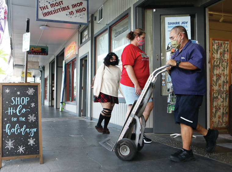 Kelsey Walling/Tribune-Herald People walk in and out of The Most Irresistible Shop in Hilo on Thursday, Dec. 10, 2020. Kamehameha Avenue was a little more full of people browsing for Christmas gifts.