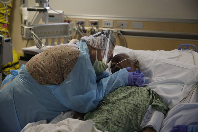 FILE - In this July 31, 2020, file photo, Romelia Navarro, 64, weeps while hugging her husband, Antonio, in his final moments in a COVID-19 unit at St. Jude Medical Center in Fullerton, Calif. The U.S. death toll from the coronavirus topped 300,000 Monday, Dec. 14, just as the country began dispensing COVID-19 shots in a monumental campaign to conquer the outbreak. (AP Photo/Jae C. Hong, File)