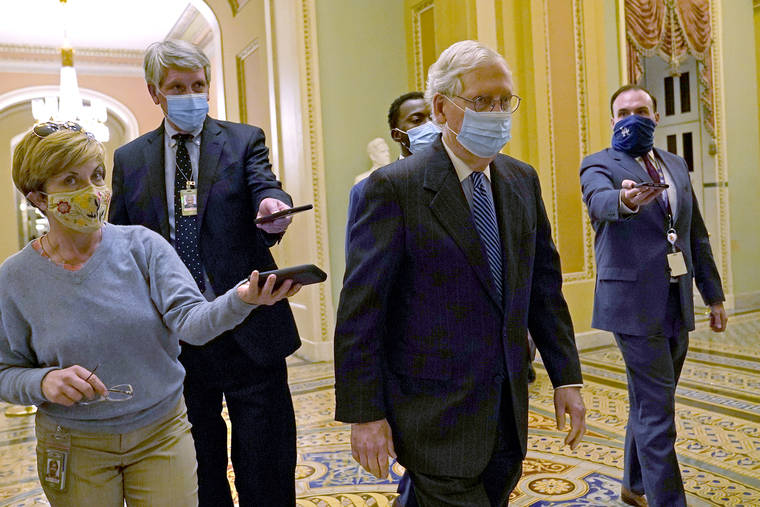 Senate Majority Leader Mitch McConnell of Ky., walks past reporters on Capitol Hill in Washington, Tuesday, Dec. 15, 2020. (AP Photo/Susan Walsh)