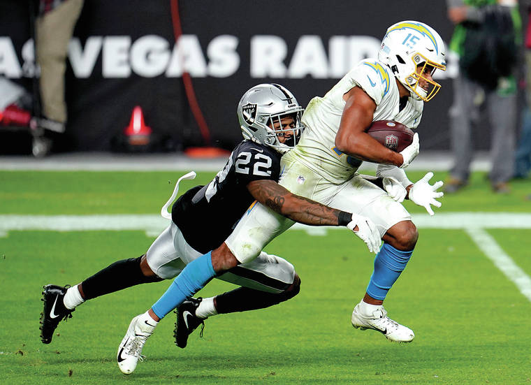 Los Angeles Chargers wide receiver Jalen Guyton (15) catches a pass in overtime against the Las Vegas Raiders Thursday in Las Vegas. (AP Photo/Jeff Bottari)