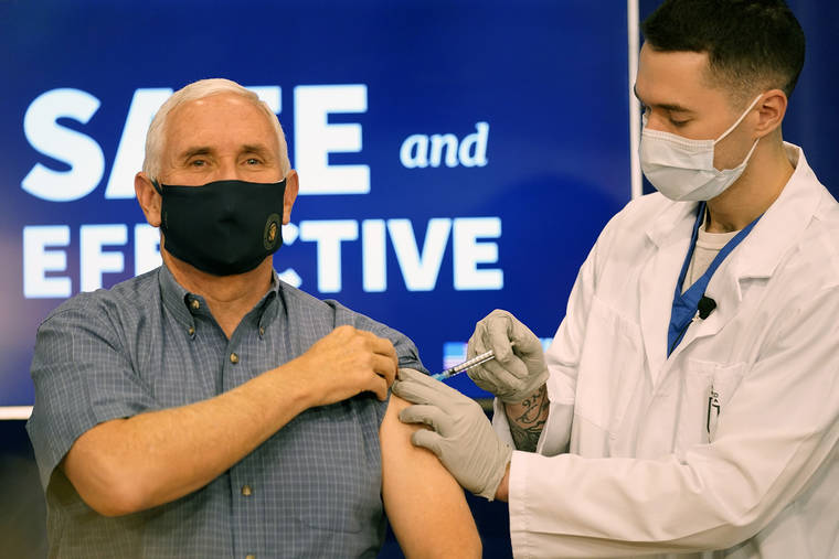 WASHINGTON — Vice President Mike Pence and the leaders of the House and Senate received their first doses of the COVID-19 vaccine on Friday as they tried to reassure the American public that the shot is safe. Pence, in a live-television event, celebrated the milestone as “a medical miracle” that could eventually put an end to a raging pandemic that has killed more than 310,000 people nationwide.