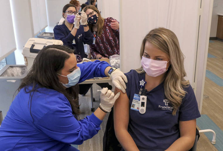 Certified Nurse Assistant Kisa Kniola, left, gives a COVID-19 vaccination to Registered Nurse Lindsay Kreighbaum on Friday at Franciscan Health in Michigan City, Ind. (John Luke/The Times via AP)