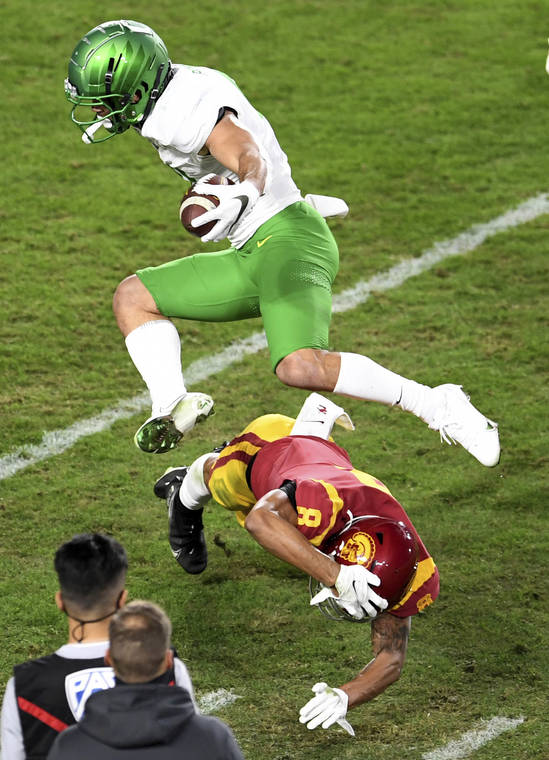 Hill made an acrobatic play to hang on to the poorly thrown ball, and Oregon’s offense ran all but 23 seconds off the clock. USC reached the Oregon 49, but the Ducks’ pass rush prevented Slovis from getting off a Hail Mary.