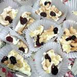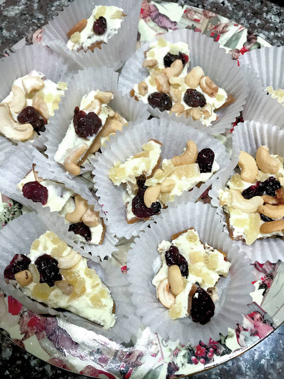 Meanwhile, melt the white chocolate in a heatproof bowl set over a pan of simmering water. Pour the chocolate over the toffee, using a spatula to spread it evenly. Immediately sprinkle on the cashews, pistachios, ginger and cranberries so they’re evenly distributed.