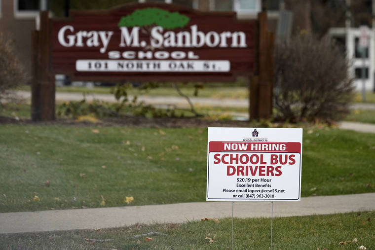 A hiring sign shows outside of Gray M. Sanborn Elementary School in Palatine, Ill., Thursday, Nov. 5, 2020. Illinois reports biggest spike in unemployment claims of all states. On Wednesday, Dec. 23, the number of Americans seeking unemployment benefits fell by 89,000 last week to a still-elevated 803,000, evidence that the job market remains under stress nine months after the coronavirus outbreak sent the U.S. economy into recession and caused millions of layoffs. (AP Photo/Nam Y. Huh)