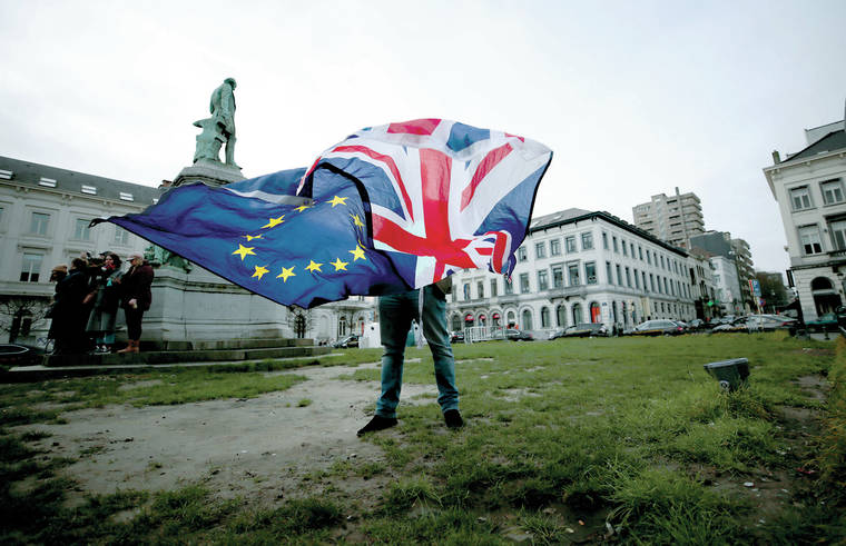 FILE - In this Thursday, Jan. 30, 2020 file photo, a man unfurls a Union and EU flag outside the European Parliament in Brussels. Britain and the European Union have struck a provisional free-trade agreement that should avert New Year chaos for cross-border traders and bring a measure of certainty for businesses after years of Brexit turmoil. (AP Photo/Virginia Mayo, File)