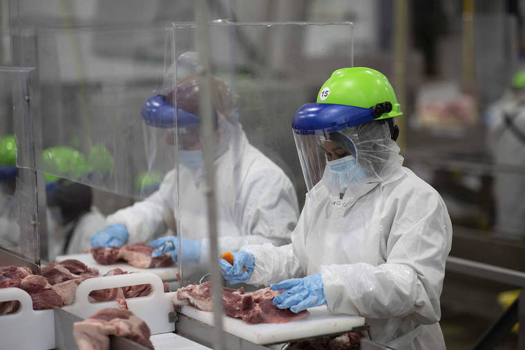This May 20, 2020, photo provided by Smithfield Foods shows some of the measures the company says it has taken to limit the spread of the coronavirus inside its plants. Workers inside its Sioux Falls, South Dakota, pork processing plant wear protective gear and are separated by plastic partitions as they carve up meat. (Photo courtesy Smithfield Foods via AP)