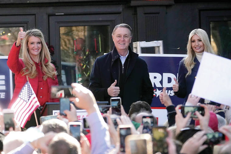 Sen. Kelly Loeffler, R-Ga., left, stands with Sen. David Perdue, R-Ga., and Ivanka Trump, assistant to the president, during a campaign rally Dec. 21 in Milton, Ga. (AP Photo/John Bazemore)