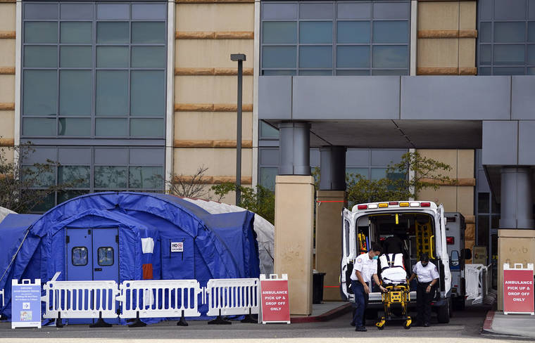 In this Dec. 17 photo, medical workers remove a stretcher from an ambulance near medical tents outside the emergency room at UCI Medical Center, in Irvine, Calif. (AP Photo/Ashley Landis, File)
