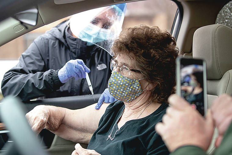 Myrtle Thompson receives a shot of the COVID-19 vaccine on Dec. 31 at a drive-thru site in Wayne, W.Va. (Sholten Singer/The Herald-Dispatch via AP)
