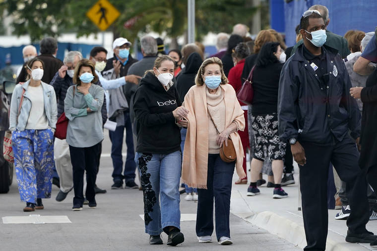 FILE - In this Jan. 6, 2021, file photo, people arrive at Jackson Memorial Hospital to receive the COVID-19 vaccine in Miami. With frustration rising over the slow rollout of the vaccine, state leaders and other politicians are turning up the pressure, improvising and seeking to bend the rules to get shots in arms more quickly. (AP Photo/Lynne Sladky, File)