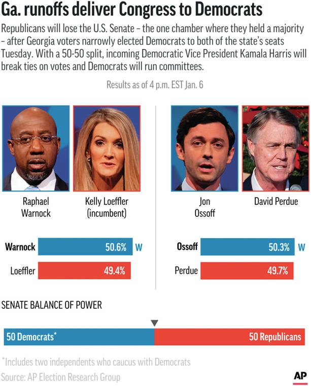ATLANTA — Democrats won both Georgia Senate seats — and with them, the U.S. Senate majority — as final votes were counted Wednesday, serving President Donald Trump a stunning defeat in his turbulent final days in office while dramatically improving the fate of President-elect Joe Biden’s progressive agenda.