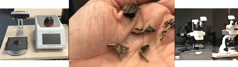 For tephra samples straight from the field, HVO has two new stereoscopes that use reflected light. Looking through them, geologists can manually separate the different components that might make up the sample, such as fresh glassy lava, crystals, and small pieces of the crater wall.