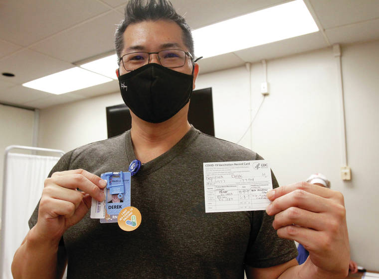 Derek Namihira is a nurse and educator at HMC and got his second dose of the Pfizer vaccine on Friday afternoon.