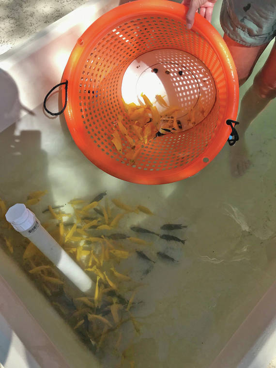 When the Terazonos, and the third person, Wayne Newman, returned to Kawaihae, officers conducted a commercial fishing gear and catch inspection of the vessel “Masako.” The inspection reportedly turned up aquarium fishing gear, including a small-mesh net, aboard the vessel, according to the department. The vessel’s hold also contained 550 live fish, all which were returned live to the ocean.