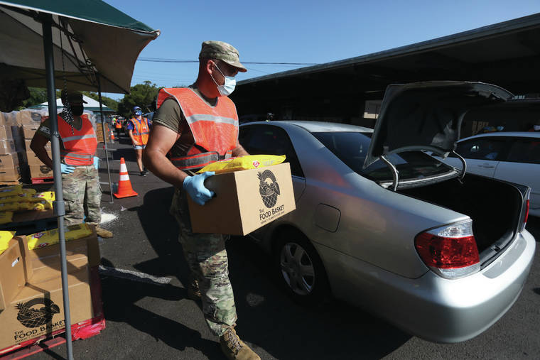 Cars were tightly packed in the parking lot of the Afook-Chinen Civic Auditorium while awaiting their turn to drive through the line for bulk groceries from Hawaii Island’s food bank.
