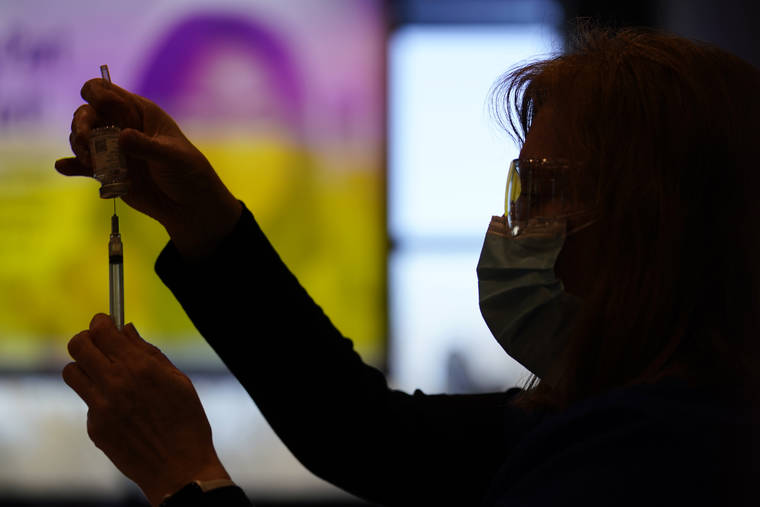 Penny Cracas, with the Chester County, Pa., Health Department, fills a syringe with COVID-19 vaccine before administering it to emergency medical workers and healthcare personnel at the Chester County Government Services Center in West Chester, Pa. Kona Community Hospital will expand vaccinations to community members over age 75 starting next week. (AP Photo/Matt Slocum, File)