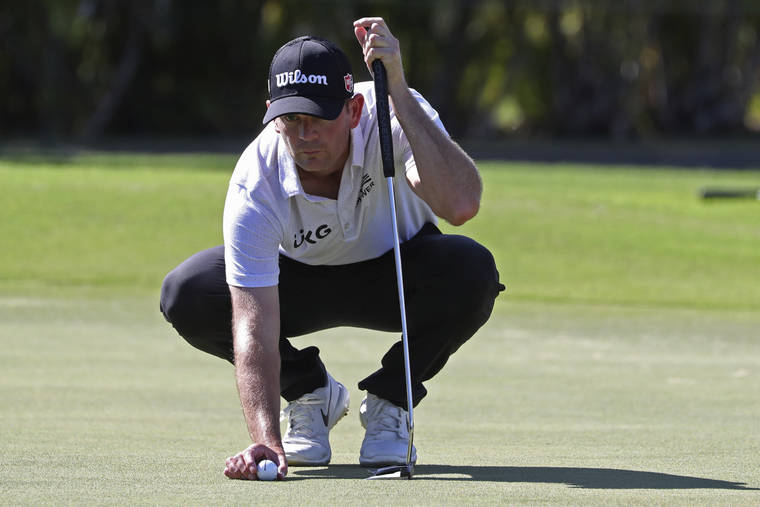 Brendan Steele lines up his putt on the ninth green during the third round at the Sony Open golf tournament Saturday in Honolulu.