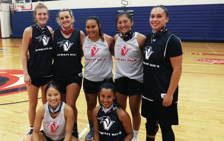 The UH-Hilo women’s basketball team’s seven returning players are, from left, top: Bree Olson, Malia Lee, Mikayla Tablit, Jenna Waki, Kim Schmelz; bottom: Sara Shimizu, Mandi Kawaha.