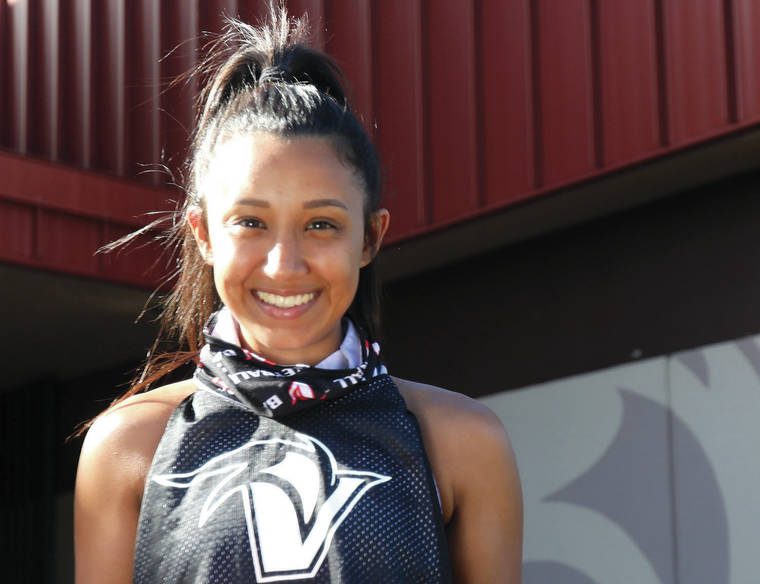During an impromptu media day before a women’s basketball practice at UHH gym, two players are first to the court. Coach David Kaneshiro worked on post moves with Bree Olson on one end, while Mandi Kawaha performed a one-player layup drill at the other basket.