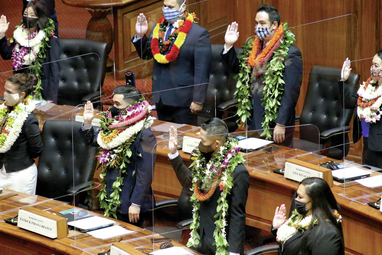 Members of the state House are sworn in Honolulu on Wednesday, Jan. 20, 2021. Lawmakers opened a new legislative session in the middle of a pandemic while wearing face masks and sitting next to clear plastic shields separating their seats. (AP Photo/Audrey McAvoy)
