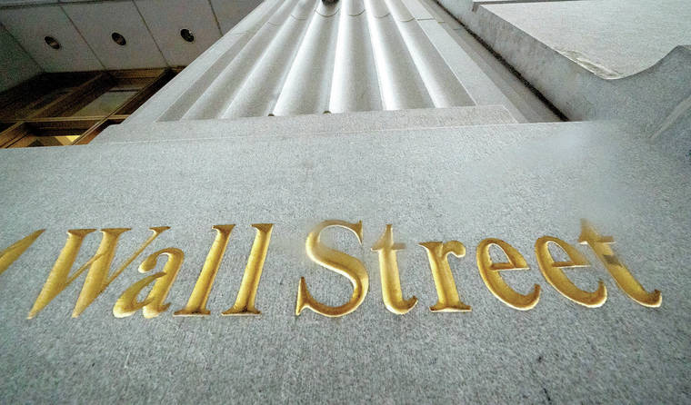 FILE - In this Nov. 5, 2020 file photo, a sign for Wall Street is carved in the side of a building. U.S. stocks are rising again Wednesday, Jan. 20, 2021, climbing toward records on stronger-than-expected earnings reports and continued optimism that an economic recovery is on the way. (AP Photo/Mark Lennihan, File)