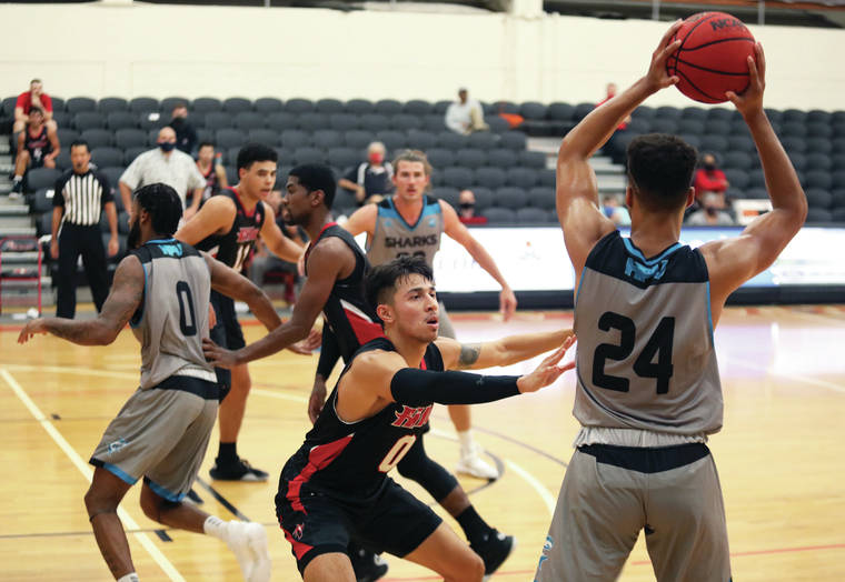 UH-Hilo guard Steven Hubbell attempts to block Hawaii Pacific guard Tavon Tarpley during a game at Vulcan Gym in Hilo on Sunday, Jan. 17, 2021.