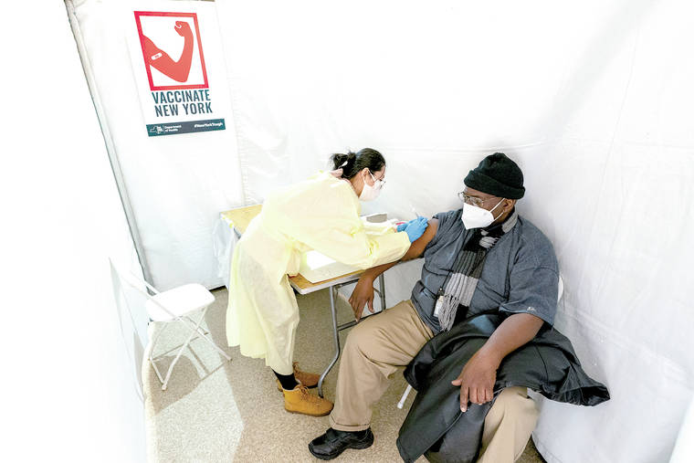FILE - In this Jan. 23, 2021, file photo, registered Nurse Shyun Lin, left, gives Roberto Fisher, 72, the first dose of the COVID-19 vaccine at a pop-up vaccination site in the William Reid Apartments in the Brooklyn borough of New York. Coronavirus deaths and cases per day in the U.S. dropped markedly over the past couple of weeks but are still running at alarmingly high levels, and the effort to snuff out COVID-19 is becoming an ever more urgent race between the vaccine and the mutating virus. (AP Photo/Mary Altaffer, Pool, File)