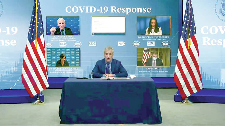 In this image from video, Jeff Zients, White House coronavirus response coordinator, speaks as Dr. Anthony Fauci, director of the National Institute of Allergy and Infectious Diseases and chief medical adviser to the president., Dr. Marcella Nunez-Smith, chair of the COVID-19 health equity task force, Dr. Rochelle Walensky, director of the Centers for Disease Control and Prevention, and Andy Slavitt, senior adviser to the White House COVID-19 Response Team,, appear on screen during a White House briefing on the Biden administration’s response to the COVID-19 pandemic Wednesday, Jan. 27, 2021, in Washington. (White House via AP)