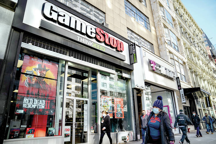 Pedestrians pass a GameStop store on 14th Street at Union Square, Thursday, Jan. 28, 2021, in the Manhattan borough of New York. Robinhood and other online trading platforms are moving to restrict trading in GameStop and other stocks that have soared recently due to rabid buying by smaller investors. GameStop stock has rocketed from below $20 to more than $400 this month as a volunteer army of investors on social media challenged big institutions who has placed market bets that the stock would fall. (AP Photo/John Minchillo)