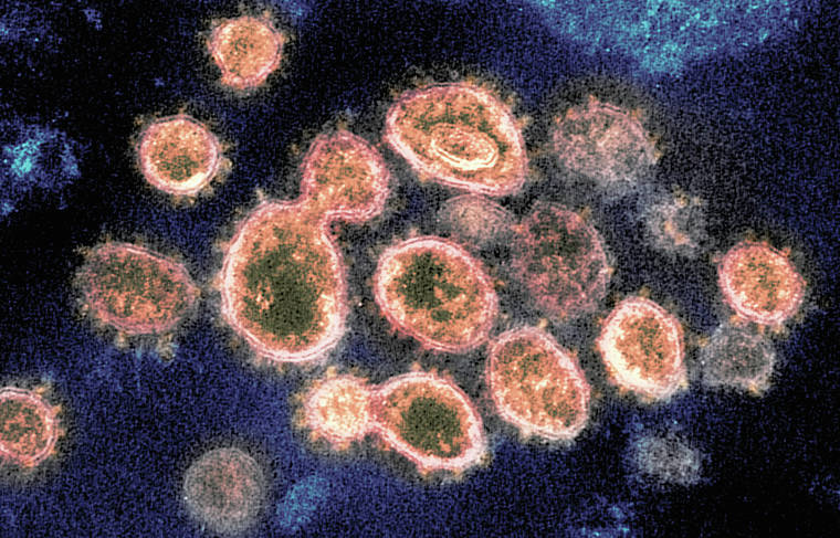 FILE - This 2020 electron microscope image provided by the National Institute of Allergy and Infectious Diseases - Rocky Mountain Laboratories shows SARS-CoV-2 virus particles which cause COVID-19, isolated from a patient in the U.S., emerging from the surface of cells cultured in a lab. Viruses are constantly mutating, with coronavirus variants circulating around the globe. (NIAID-RML via AP)