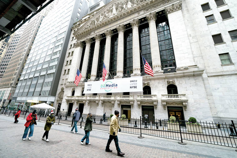 Pedestrians pass the New York Stock Exchange, Wednesday, Jan. 27, 2021, in New York. Major indexes opened lower on Wall Street Friday, Jan. 29, while shares of GameStop, AMC and several other stocks being targeted by a rowdy community of amateur investors soared again. (AP Photo/John Minchillo)