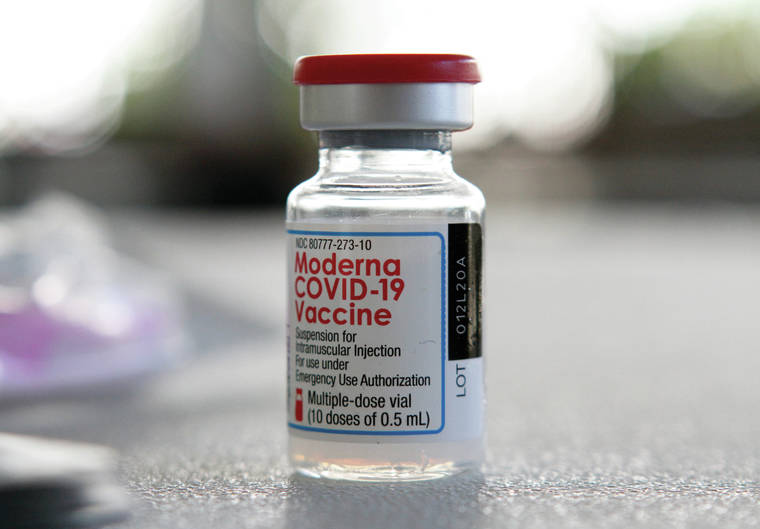 A vial holds ten doses of the Moderna COVID-19 vaccine at Yukio Okutsu State Veterans Home in Hilo on Jan. 8. (KELSEY WALLING/Tribune-Herald file photo)