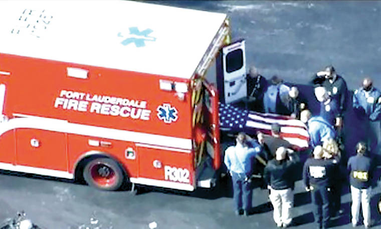 After the shootings Tuesday, police motorcycles with their lights flashing escorted a fire rescue truck as it brought the body of one of the agents to the medical examiner’s office in nearby Dania Beach. Law enforcement officials from numerous agencies lined up to pay their respects as a flag-covered body was removed from the vehicle and taken inside.
