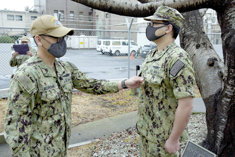 Yeoman 2nd Class Brayden Chung-Yuen, a native of Hilo, receives the Navy and Marine Corps Achievement Medal after a successful three-year tour at Commander, Submarine Group 7. Chung-Yuen was responsible for the command’s $1.5 million travel budget, government travel card program, personal awards program and pay and personnel program. He is being redeployed to Oahu to serve on the attack submarine USS Illinois.
