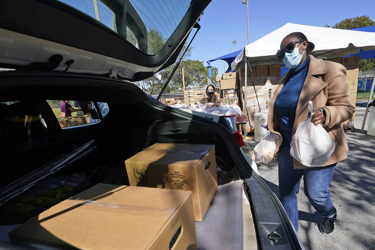 Deldra Owens, legislative director for Miami-Dade County Commissioner Danielle Cohen Higgins, loads bags of food into the trunk of a car as she helps out, Wednesday, Feb. 3, 2021, during a drive-thru food distribution event at J.D. Redd Park in Homestead, Fla. (AP Photo/Wilfredo Lee)