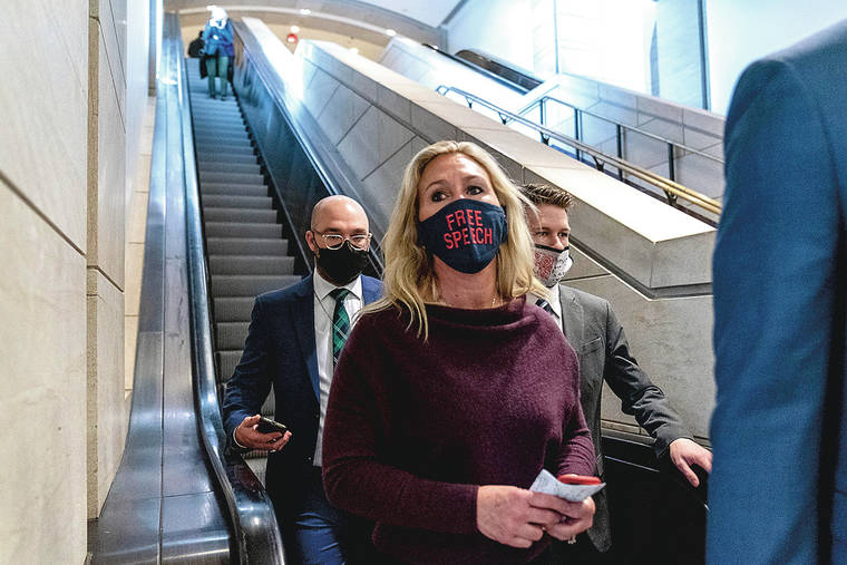 The chamber’s near party-line 230-199 vote was the latest instance of conspiracy theories becoming pitched political battlefields, an increasingly familiar occurrence during Donald Trump’s presidency. He faces Senate trial next week for his House impeachment for inciting insurrection after a mob he fueled with his false narrative of a stolen election attacked the Capitol.