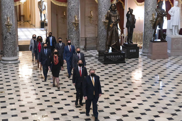 Acting Sergeant at Arms Timothy Blodgett, bottom right, leads Rep. Jamie Raskin, D-Md., the lead Democratic House impeachment manager, Rep. David Cicilline, D-R.I., Rep. Diana DeGette, D-Colo., Rep. Joaquin Castro, D-Texas, Rep. Eric Swalwell, D-Calif., Rep. Ted Lieu, D-Calif., Delegate Tacey Plaskett, D-V.I., Rep. Madeleine Dean, D-Pa., and Rep. Joe Neguse, D-Colo., through Statuary Hall to the Senate for the second impeachment trial of former President Donald Trump Tuesday in Washington. (AP Photo/Manuel Balce Ceneta)