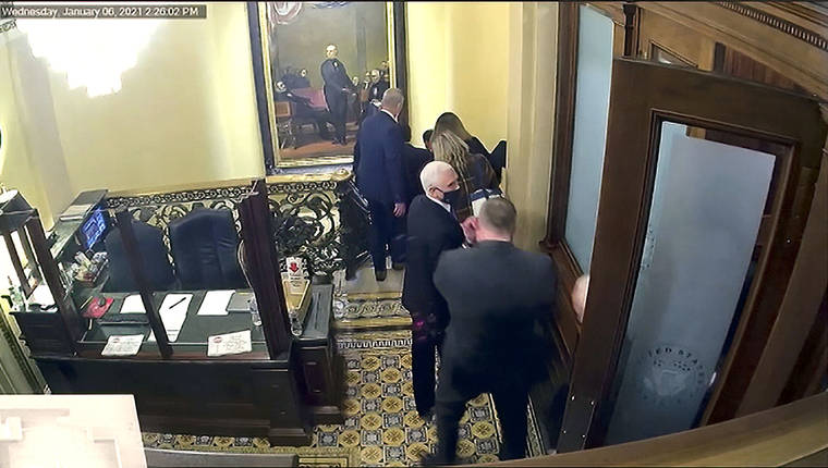 Pence, who had been presiding over a session to certify Biden’s victory over Trump — thus earning Trump’s criticism — is shown being rushed to safety, sheltered in an office with his family just 100 feet from the rioters. Pelosi was evacuated from the complex before the mob prowls her suite of offices, her staff hiding quietly behind closed doors.