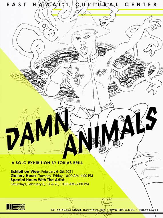 Brill has been exhibiting in Hilo, Honolulu and venues in California and New York since 1993. His limited-edition book, “Damn Animals” (a coloring book for adults), will be available for purchase at the EHCC gallery during his exhibition.