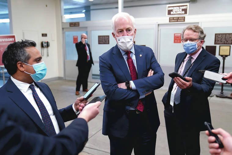 Sen. John Cornyn, R-Texas, talks with reporters Thursday on Capitol Hill in Washington, after the third day of the second impeachment trial of former President Donald Trump. (AP Photo/Susan Walsh)